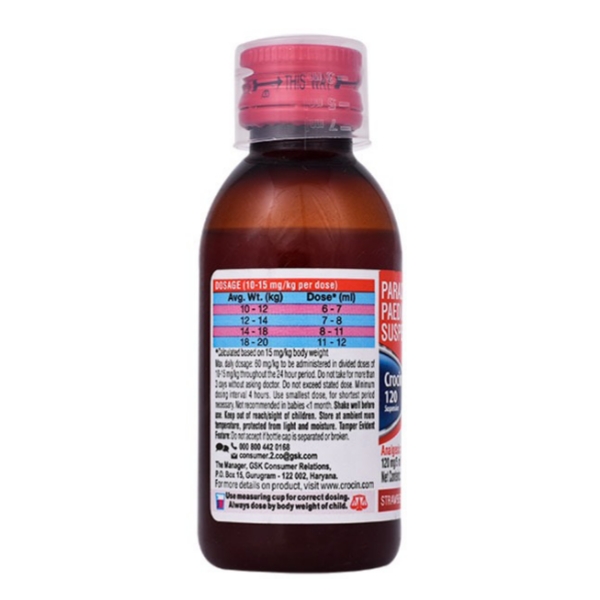 Always give Crocin 120 Suspension Strawberry Flavour to your child as advised by your physician. The usual dose of this medicine depends on the child’s age and body weight. Inform your doctor if your child has kidney or liver problem, severe infection, or is malnourished or underweight.